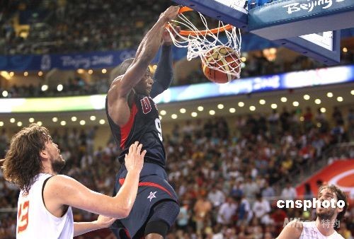 北京奧運會男子籃球小組賽第四輪比賽8月16日在五棵松籃球館舉行,同為三戰(zhàn)三勝的美國“夢八隊”、世錦賽冠軍西班牙隊,午夜時分展開驚心動魄的激情碰撞。最后美國隊以119比82擊敗西班牙隊。圖為韋德突破加索爾兄弟的防守扣籃。中新社發(fā) 任晨鳴 攝