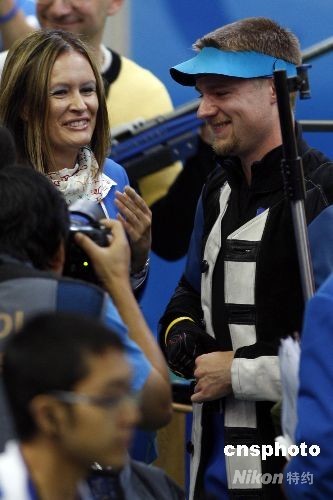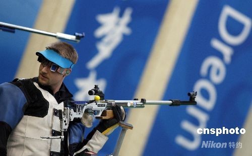 8月17日,男子50米步槍三種姿勢決賽在北京射擊館進行,中國選手邱健奪得金牌。13:52分,男子步槍三姿第10輪邱健驚天逆轉(zhuǎn)得金牌。本來以為得到銀牌已經(jīng)是最好的結(jié)果,一直領(lǐng)先的美國選手埃蒙斯雖沒有像上一屆奧運會一樣脫靶,但是他最后一槍居然只打出了4.4環(huán),埃蒙斯又一次與奧運金牌夢想失之交臂。中新社發(fā) 盛佳鵬 攝