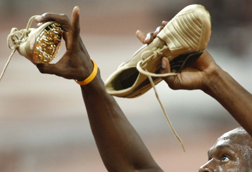 博爾特在刷洗百米紀(jì)錄奪冠后展示黃金跑鞋,還不忘伸出手指說一聲我是NO.1。中新社記者 盛佳鵬 攝