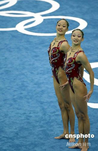8月18日,北京奧運會花樣游泳比賽在“水立方”拉開帷幕,在首場比賽雙人技術(shù)自選項目中,中國選手蔣文文、蔣婷婷以48.084的總分排名第四位。 中新社發(fā) 杜洋 攝