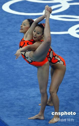 8月18日,北京奧運會花樣游泳比賽在“水立方”拉開帷幕,在首場比賽雙人技術(shù)自選項目中,日本選手原田早穗、鈴木繪美子以48.250的總分排名第三位。中新社發(fā) 杜洋 攝
