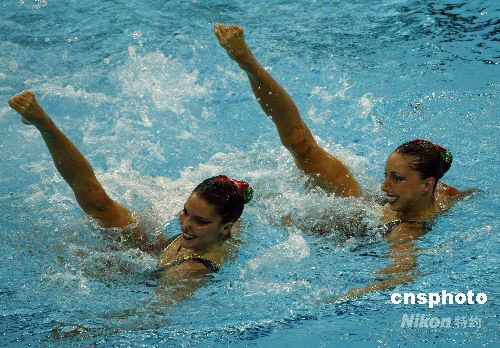 8月18日,北京奧運會花樣游泳比賽在“水立方”拉開帷幕,在首場比賽雙人技術(shù)自選項目中,西班牙選手安德魯·富恩特斯、赫瑪 ·門瓜爾以48.834的總分排名第2位。中新社發(fā) 杜洋 攝