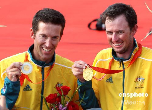 8月18日,北京2008奧運(yùn)帆船比賽在青島分賽場(chǎng)舉行,澳大利亞隊(duì)內(nèi)森·威爾莫特和馬爾科姆·佩奇組合獲得雙人艇男子470級(jí)冠軍。 中新社發(fā) 趙振清 攝