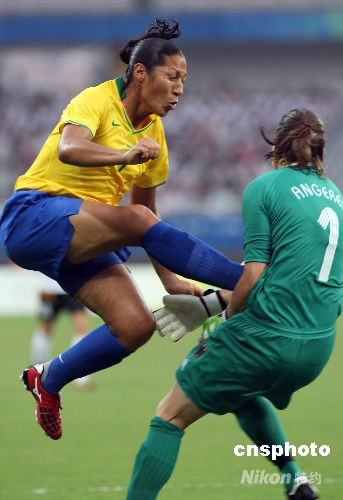 8月18日,北京奧運會女足半決賽,德國VS巴西的比賽在上海體育場進行。最終巴西隊以4:1大勝世界冠軍德國隊。激烈異常的比賽場面,讓觀眾領略了競技體育的“殘酷”。圖為巴西隊7號達妮埃拉沖撞守門員。 中新社發(fā) 湯彥俊 攝