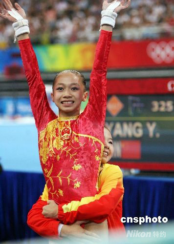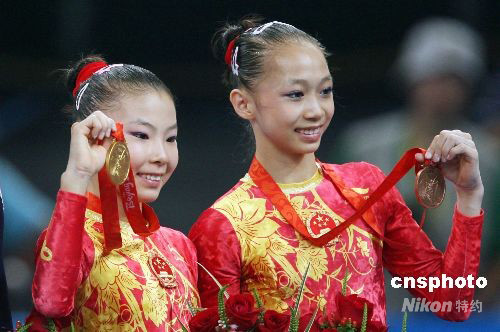 8月18日,中國選手何可欣(左)在北京奧運(yùn)會女子高低杠決賽中16.725分的成績奪得金牌,隊(duì)友楊伊琳獲得銅牌。 中新社發(fā) 武仲林 攝