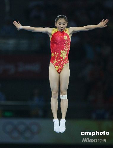 8月18日,中國(guó)選手何雯娜在北京奧運(yùn)會(huì)女子蹦床比賽中以37.80分奪得冠軍。 中新社發(fā) 武仲林 攝