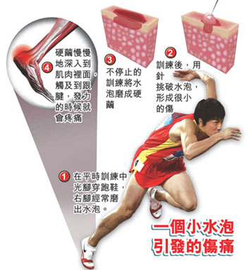 對于劉翔的教練孫海平指劉翔因其腳跟的骨較正常人突出而令其右腳跟腱部易于發(fā)炎,陸家美指“就高水平的運動員來說,身體有勞損是在所難免,而在短跑如100米及110米欄的運動員來說更是常見。”