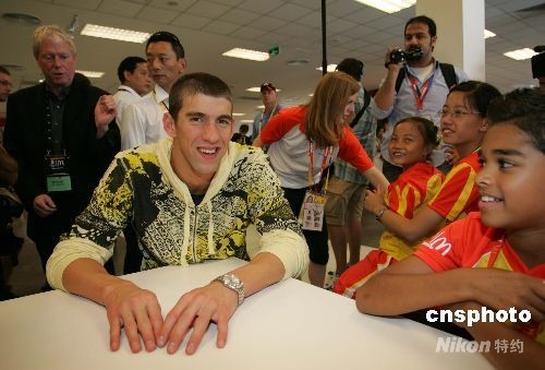 2008年8月18日,奧林匹克公園餐廳內(nèi),菲爾普斯小朋友交談。當(dāng)日,獲得8枚奧運(yùn)金牌的美國(guó)游泳冠軍菲爾普斯來到奧林匹克公園餐廳與40多名中外各國(guó)的“奧運(yùn)助威小冠軍”見面交流,與小朋友們一起分享勝利的喜悅。中新社發(fā) 曉村 攝