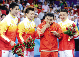 當(dāng)三位隊(duì)員戴上沉甸甸的金牌,王勵(lì)勤向臺下的人指了指,王皓、馬琳也急忙揮手,不一會劉國梁終于走上了頒獎(jiǎng)臺,只見王皓與馬琳一左一右摟著劉國梁,然后隊(duì)員們紛紛摘下自己的金牌套在他的脖子上,中國男團(tuán)的眾志成城、團(tuán)結(jié)一心叫人印象深刻,他們所做的一切為的就是完成國人對于國球不變的期望。