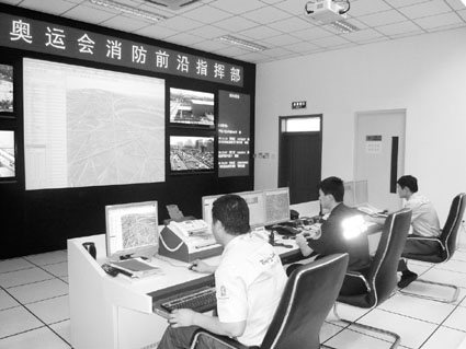 奧運(yùn)消防前沿指揮部中的“奧秘”遠(yuǎn)不止于此。記者了解到,奧運(yùn)消防前沿指揮部與31個(gè)奧運(yùn)會(huì)比賽場(chǎng)館消防通信指揮室、26個(gè)現(xiàn)場(chǎng)臨時(shí)消防站和3個(gè)奧運(yùn)永久消防站均配有有線、無線、計(jì)算機(jī)、網(wǎng)絡(luò)、視頻監(jiān)控和建筑消防設(shè)施遠(yuǎn)程監(jiān)控等通信指揮技術(shù)裝備,形成了完整統(tǒng)一、靈敏高效的通信指揮體系。