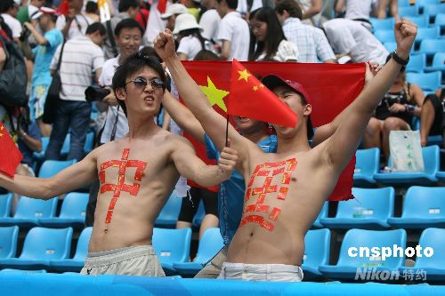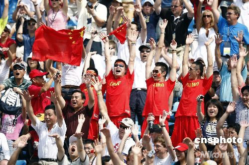 8月19日,女子沙灘排球半決賽第51場(chǎng)在北京朝陽公園沙灘排球場(chǎng)進(jìn)行。中國(guó)選手王潔、田佳2:1戰(zhàn)勝同門師妹薛晨、張希晉級(jí)決賽。圖為激情球迷現(xiàn)場(chǎng)助威。 中新社發(fā) 武仲林 攝