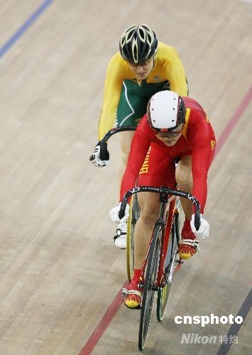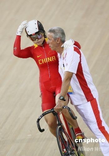8月19日,2008北京奧運(yùn)會(huì)場(chǎng)地自行車女子爭(zhēng)先賽半決賽在老山自行車館進(jìn)行,中國(guó)自行車“希望之星”郭爽因第三戰(zhàn)決勝戰(zhàn)因?yàn)榕c對(duì)手米亞雷斯有身體接觸犯規(guī)被處罰取消成績(jī),因此遭逆轉(zhuǎn)惜敗無緣決賽,只能與荷蘭選手卡尼斯?fàn)帄Z銅牌。中新社發(fā) 武仲林 攝