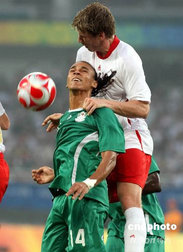 8月19日,北京奧運會男足半決賽,尼日利亞對比利時的比賽在上海體育場進行。最終,尼日利亞隊以4:1戰(zhàn)勝比利時晉級奧運男足決賽。圖為尼日利亞14號彼得·奧登文吉(綠衣)與比利時球員爭搶頭球。 中新社發(fā) 湯彥俊 攝