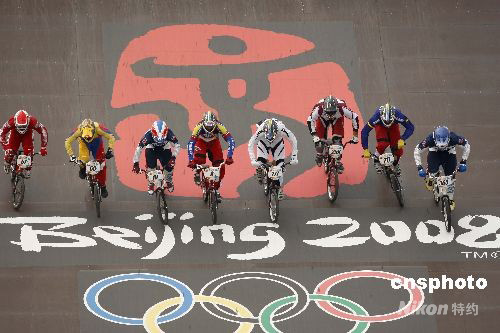 8月20日,北京奧運(yùn)會(huì)男子小輪車競速賽在北京老山小輪車賽場進(jìn)行了1/4決賽的爭奪。經(jīng)過三輪的較量,最終來自世界各國的16位選手成功進(jìn)入了半決賽的較量,他們將在明天展開新一輪的爭奪。圖為比賽現(xiàn)場。 中新社發(fā) 盛佳鵬 攝