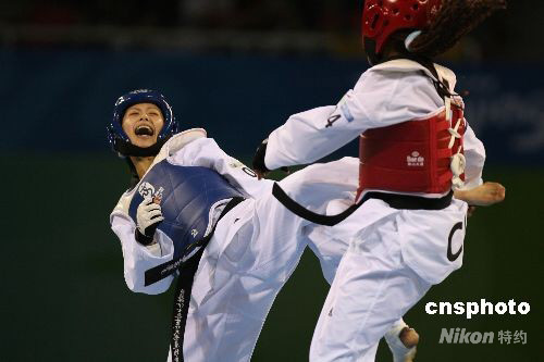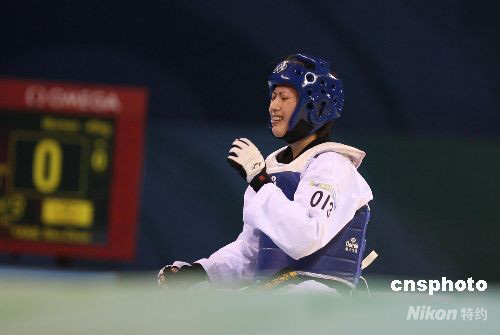 8月20日,中華臺北選手楊淑君,在北京奧運會跆拳道女子49公斤以下級銅牌爭奪戰(zhàn)中負(fù)于古巴選手,無緣獎牌。 中新社發(fā) 武仲林 攝