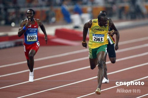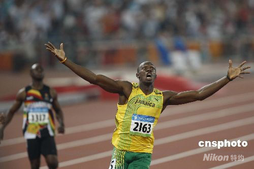 8月20日晚,國家體育場舉行的北京奧運會男子200米決賽中,牙買加選手尤塞恩·博爾特以19.30創(chuàng)造新的世界紀錄并獲得金牌。這是他在本屆奧運會上繼百米金牌后奪得的第二枚金牌。 中新社發(fā) 盛佳鵬 攝