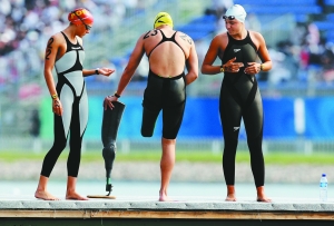 昨天的順義奧林匹克公園,冠軍、亞軍、季軍依次游過終點,不過觀眾們?nèi)栽诘却粋人。在所有人眼中,她也是這場比賽的英雄。當南非選手納塔莉·杜托伊特第十六個游過終點,所有觀眾起立為她歡呼。作為奧林匹克史上第一個截肢運動員,獲得冠軍的俄羅斯選手拉里莎認為她也值得獲一枚獎牌,“并不是精神意義的,而是競技意義上的!