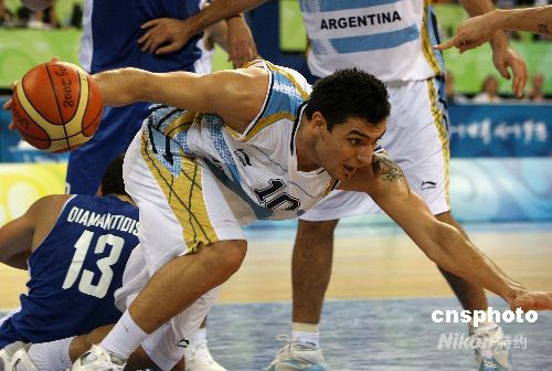 北京奧運會男籃最后一場八進四比賽,8月20日午夜時分在五棵松籃球館舉行,南美洲冠軍、雅典奧運會冠軍阿根廷隊以80比78驚險戰(zhàn)勝歐洲勁旅希臘隊,進入前四名。阿根廷隊將與美國“夢八隊”爭奪決賽權(quán)。隊中“老大”、在NBA馬刺隊效力的球星吉諾比利不僅砍下全場最高的24分,而且在最后時刻投中關(guān)鍵一球;另一名球星10號德爾菲諾(DELFINO Carios Francisco)砍下23分。中新社發(fā) 任晨鳴 攝
