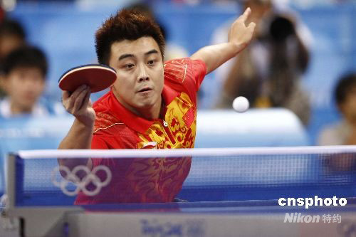 8月21日,北京奧運會乒乓球男子單打第三輪的比賽在北京大學體育館進行,中國選手王皓4比0戰(zhàn)勝奧地利選手陳衛(wèi)星晉級下一輪比賽。圖為王皓在比賽中。中新社發(fā) 盛佳鵬 攝