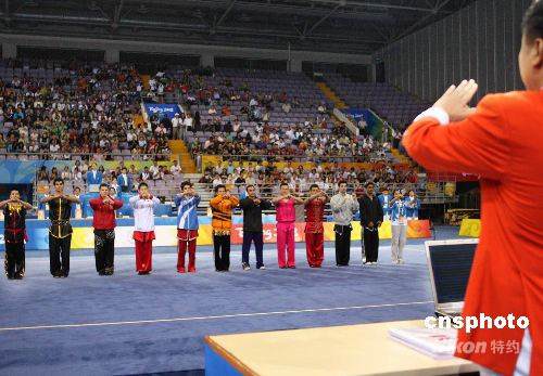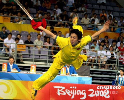 8月21日,“北京2008武術比賽”在北京奧林匹克體育中心體育館拉開帷幕。“北京2008武術比賽”經(jīng)國際奧委會批準,由北京奧組委、國際武術聯(lián)合會主辦,中國武術協(xié)會承辦,于8月21日至24日在北京舉行。比賽設套路10枚金牌、散手5枚金牌。有來自世界五大洲43個國家和地區(qū)的128名男女運動員參加比賽。為了使更多國家和地區(qū)的運動員在本次比賽中獲得獎牌,國際武術聯(lián)合會做出了在15個比賽項目中,每個國家和地區(qū)最多只能參加8項的規(guī)定。中新社發(fā) 宋吉河 攝
