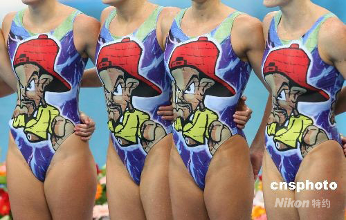 8月22日,北京奧運(yùn)會(huì)花樣游泳集體技術(shù)自選比賽在國(guó)家游泳中心舉行,西班牙隊(duì)名列第二。圖為西班牙隊(duì)別致的泳裝,引人注目。 中新社發(fā) 武仲林 攝