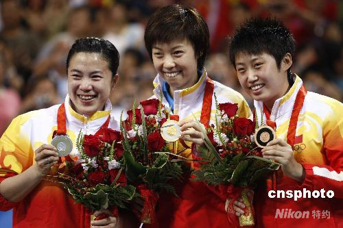 8月22日晚,在北京大學(xué)體育館進(jìn)行的北京奧運(yùn)會(huì)乒乓球女子單打決賽中,中國(guó)乒乓球名將張怡寧以4-1戰(zhàn)勝自己的隊(duì)友王楠,為中國(guó)代表團(tuán)贏得本屆奧運(yùn)會(huì)第47枚金牌。王楠獲得銀牌,另一名中國(guó)選手郭躍獲得銅牌。 中新社發(fā) 盛佳鵬 攝