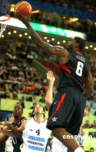 8月22日晚,北京奧運(yùn)會(huì)男子籃球半決賽第二場(chǎng)比賽在五棵松籃球館開戰(zhàn),志在奪冠的美國(guó)“夢(mèng)八隊(duì)”遭遇雅典奧運(yùn)會(huì)冠軍阿根廷隊(duì),最后以101比81獲勝,進(jìn)入決賽!皦(mèng)八隊(duì)”將與西班牙隊(duì)爭(zhēng)奪本屆奧運(yùn)會(huì)的男籃金牌。中新社發(fā) 任晨鳴 攝