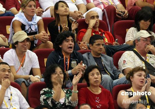 北京奧運會男子籃球半決賽第二場比賽8月22日晚在五棵松籃球館開戰(zhàn),志在奪冠的美國“夢八隊”遭遇雅典奧運會冠軍阿根廷隊,最后美國隊以101比81擊敗阿根廷隊,進入決賽!扒蛲酢瘪R拉多納到場為本國球隊助威加油。中新社發(fā) 任晨鳴 攝