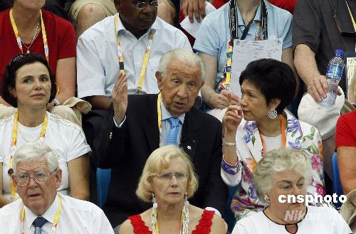 8月23日,國際奧委會終身名譽主席薩馬蘭奇,來到北京“水立方”觀看奧運會花樣游泳集體項目決賽。 中新社發(fā) 杜洋 攝