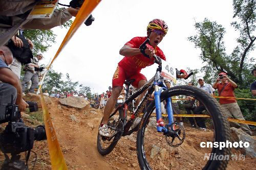 8月23日,在北京老山山地自行車(chē)場(chǎng)進(jìn)行的奧運(yùn)會(huì)男子自行車(chē)越野賽中,中國(guó)選手姬建華名列第22位。中新社發(fā) 盛佳鵬 攝