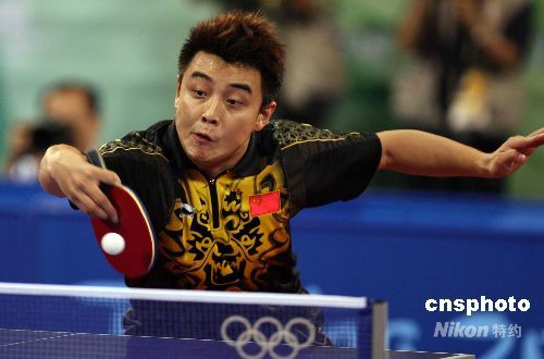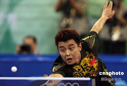 8月23日晚,王皓在北京奧運(yùn)會(huì)乒乓球男子單打決賽中以1:4負(fù)于隊(duì)友馬琳,獲得亞軍。中新社發(fā) 武仲林 攝