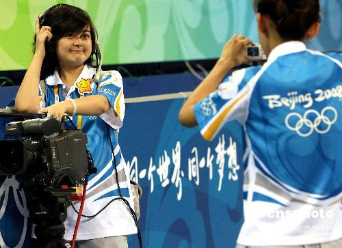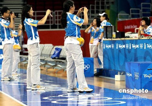 8月24日,北京奧運會閉幕日,在北京五棵松籃球館服務了1個多月的大學生志愿者們,清晨到籃球場內拍攝珍貴的留念照。北京奧運會的賽會志愿者大多數(shù)是北京地區(qū)的在校大學生,他們的整體服務受到與會者的高度評價。中新社發(fā) 任晨鳴 攝