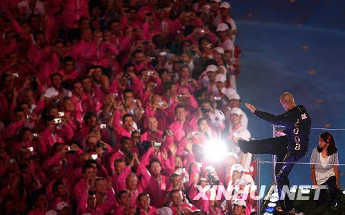 8月24日,北京奧運會閉幕式在鳥巢舉行。在“倫敦8分鐘”的表演中,英國球星大衛(wèi)·貝克漢姆(右二)亮相,踢出“倫敦邀請”。