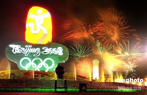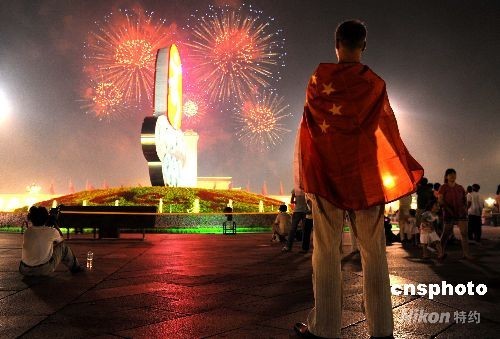8月24日晚,一名外國(guó)人身披中國(guó)國(guó)旗在天安門廣場(chǎng)觀看慶祝奧運(yùn)會(huì)閉幕而燃放的煙花。中新社發(fā) 廖攀 攝