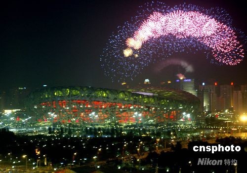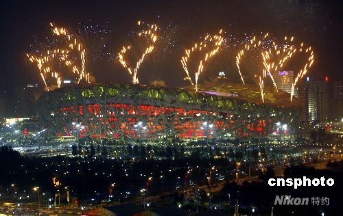 鳥巢上空燃放祥云圖案焰火。 中新社發(fā) 王麗南 攝