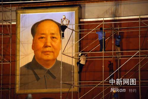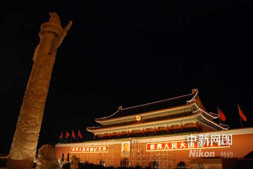 8月25日晚,為迎接殘奧會,工人們正對天安門城樓進(jìn)行重新裝修。據(jù)工作人員介紹,目前天安門城樓上搭建的腳手架主要是為了進(jìn)行城樓外墻的粉刷。(楊慧峰/攝影)