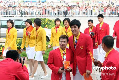 8月26日,2008年北京奧運(yùn)會(huì)中國(guó)體育代表團(tuán)總結(jié)大會(huì)在北京人民大會(huì)堂金色大廳舉行,運(yùn)動(dòng)員劉翔出席大會(huì)倍受關(guān)注。圖為北京奧運(yùn)會(huì)舉重冠軍張湘祥與劉翔合影。 中新社發(fā) 廖文靜 攝