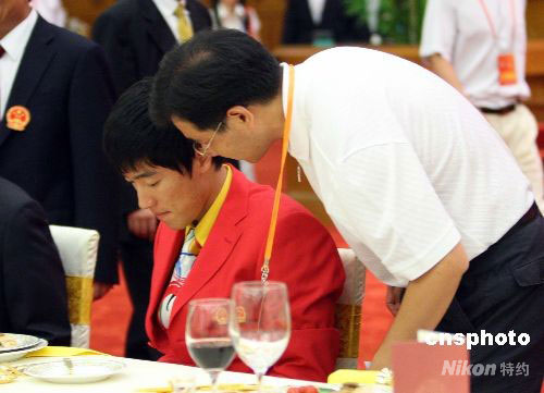 劉翔參加北京奧運(yùn)中國體育代表團(tuán)宴會(huì)。 中新社發(fā) 廖文靜 攝