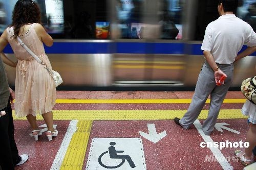 8月27日,一種白色無障礙標識開始在北京地鐵1號、2號線各站臺出現(xiàn),使北京地鐵無障礙設施進一步得到完善,迎接即將到來的殘奧會。圖為北京地鐵2號線阜成門站臺的白色無障礙標識。中新社發(fā) 鄭雄增 攝