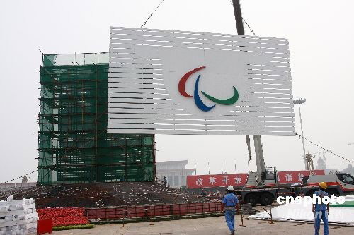 8月28日,北京殘奧會會徽開始在天安門廣場安裝。廣場東側(cè),20個殘奧會運動標志取代了28個奧運會運動標志。輪椅橄欖球、輪椅籃球、硬地滾球、自行車、馬術等殘奧會運動造型初露。中新社發(fā) 追影 攝