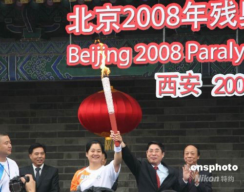 圖為在東門城樓下,北京殘奧會火炬?zhèn)鬟f西安站第一棒火炬手、全國殘疾人“十佳運動員”張輝(左)與陜西省省長袁純清共同高擎火炬。 中新社發(fā) 段維 攝