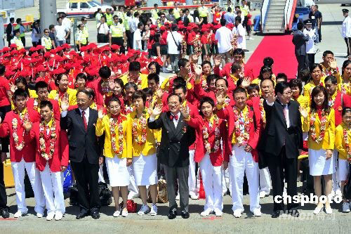 中新網(wǎng)8月29日電 北京奧運(yùn)會(huì)國家隊(duì)金牌運(yùn)動(dòng)員代表團(tuán)于29日中午11時(shí)許抵達(dá)香港。香港特首曾蔭權(quán)前往迎接。