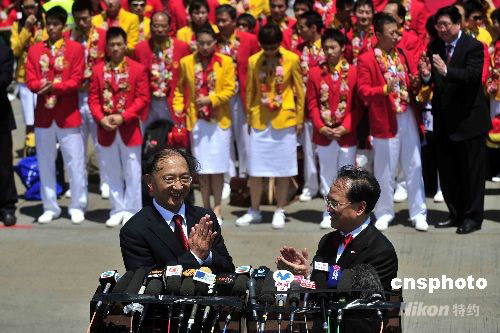 八月二十九日上午十一時,國家奧運金牌運動員代表團乘坐飛機抵達香港,特區(qū)行政長官曾蔭權等官員到場迎接。率團來港的國家體育總局局長劉鵬(左)表示,今次來港目的是為真誠感謝對祖國體育事業(yè)大力支持的香港同胞。中新社發(fā) 譚達明 攝