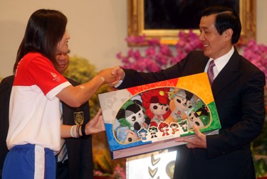 8月26日,中華臺北奧運(yùn)代表團(tuán)掌旗官(旗手)賴圣蓉(左)贈送北京奧運(yùn)福娃給馬英九。(“中央社”圖)