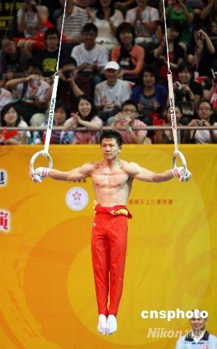 “帥哥”陳一冰首次赤膊上陣,展示吊環(huán)十字支撐動(dòng)作,博得全場(chǎng)觀眾的歡呼和掌聲。中新社發(fā) 洪少葵 攝