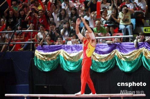 奧運(yùn)男子雙杠金牌選手李小鵬精彩表演后,站在雙杠上和觀眾招手致意。中新社發(fā)  洪少葵 攝