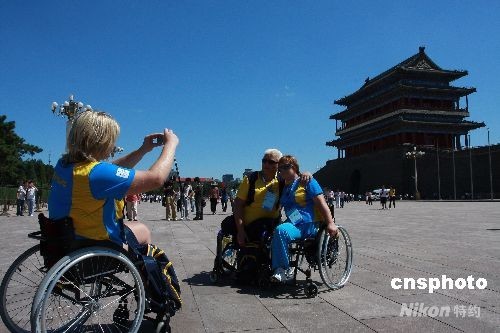 8月31日,北京天安門廣場(chǎng)晴空萬(wàn)里,一批外國(guó)殘奧會(huì)代表團(tuán)成員樂(lè)游北京天安門廣場(chǎng)。中新社發(fā) 鄭雄增 攝