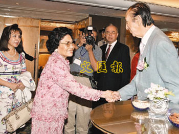 郭鄺肖卿和何鴻燊握手致意。(圖片來源:文匯報(bào))