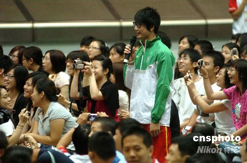 訪問澳門的奧運(yùn)金牌運(yùn)動(dòng)員代表九月一日上午與澳門青少年真情對話。澳門五十所學(xué)校二千五百名學(xué)生出席對話會。圖為澳門學(xué)生踴躍提問。中新社發(fā) 畢永光 攝