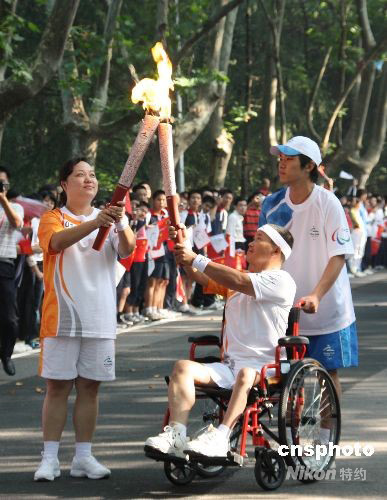 九月二日上午,北京殘奧會圣火來到古都南京,受到民眾的熱烈歡迎,圖為火炬手進行火炬?zhèn)鬟f。中新社發(fā) 牛莉 攝